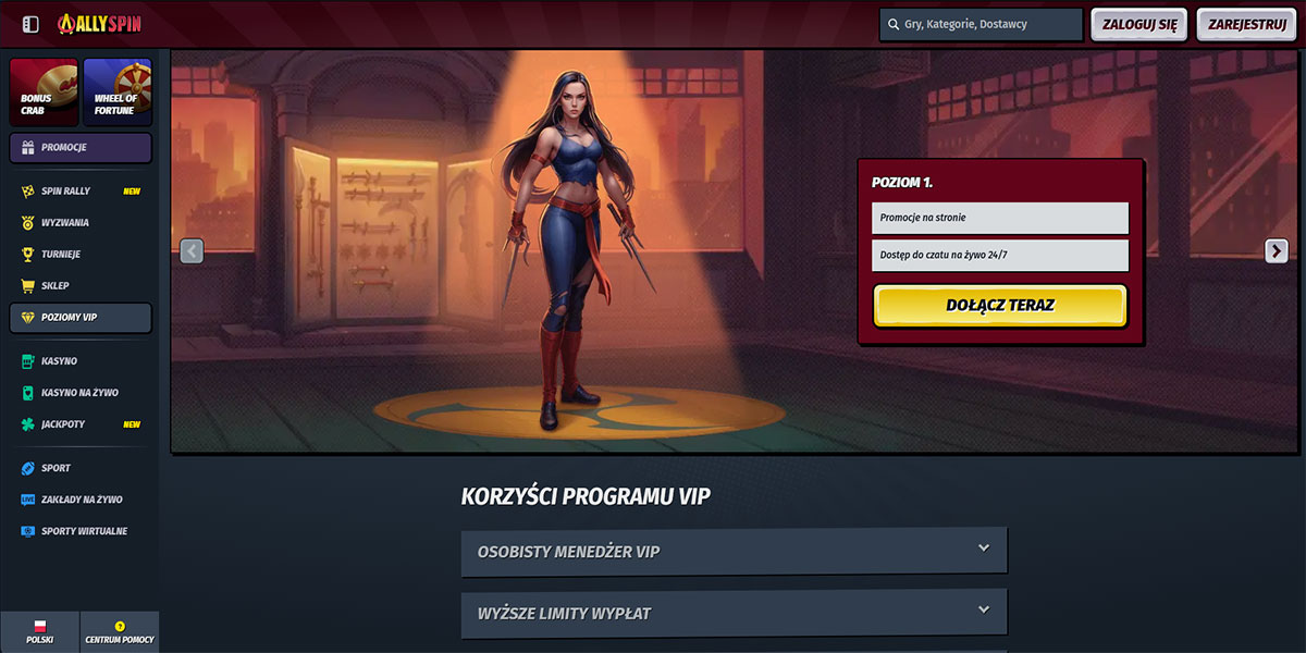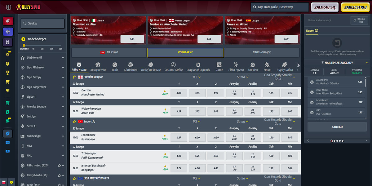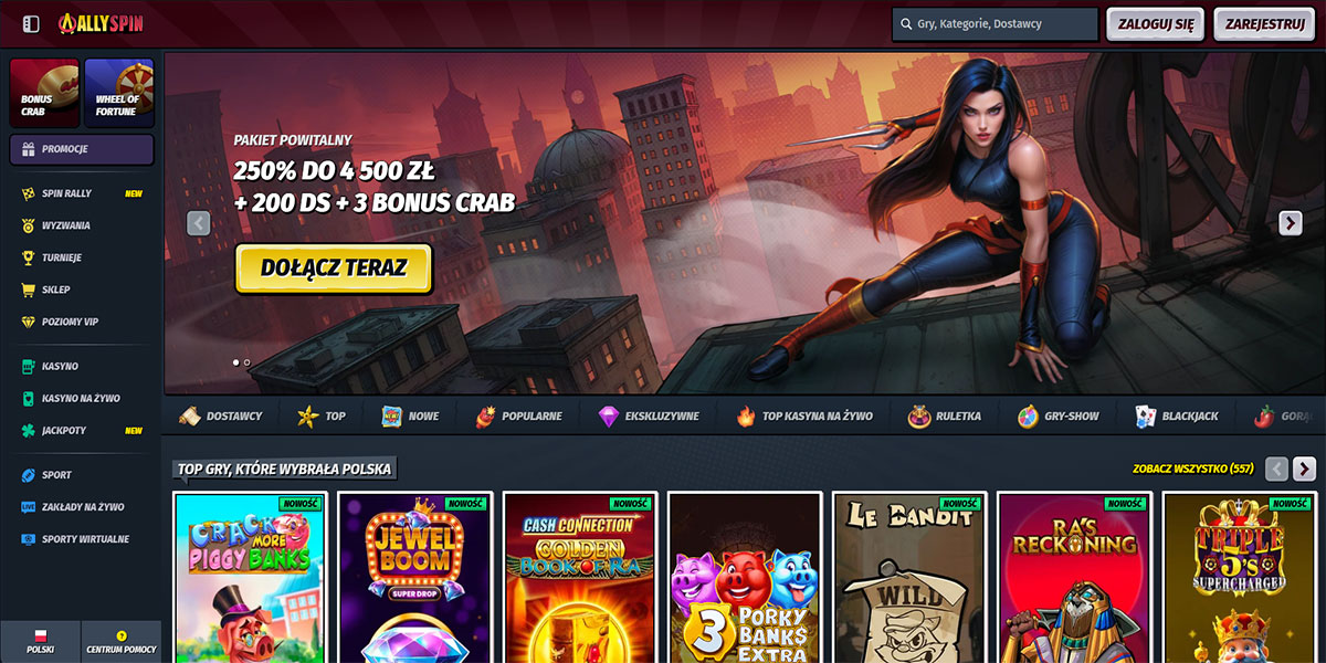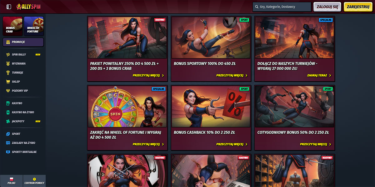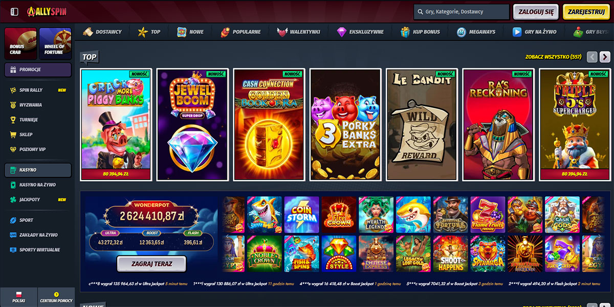 Kasyno AllySpin weszło na rynek w 2024 roku pod szyldem Stellar LTD z jasnym celem: oferować szeroki wybór, różnorodność i elastyczność. Platforma łączy gry kasynowe, stoły na żywo i zakłady sportowe na jednym koncie, z pełną obsługą płatności w złotówkach (po konwersji) i wsparciem dla kryptowalut. Interfejs jest przejrzysty i szybki, z intuicyjną nawigacją i solidną wydajnością na komputerze i urządzeniach mobilnych. Dla polskich graczy platforma działa bezproblemowo, oferując niskie progi wejścia i rozbudowaną strukturę bonusową związaną zarówno z grą w kasynie, jak i zakładami sportowymi.