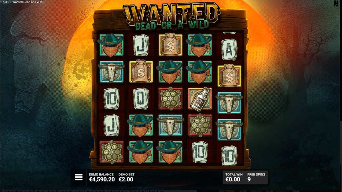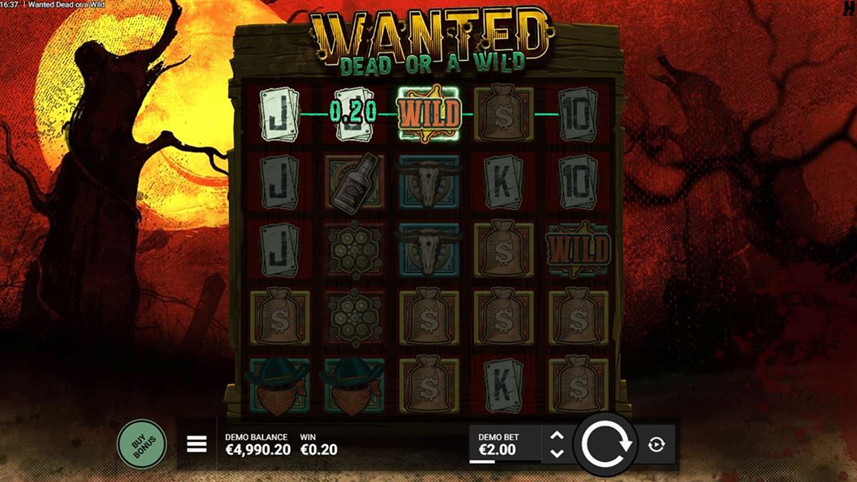 Gra wykorzystuje tradycyjny układ 5×5 z 15 liniami wygrywającymi, gdzie wygrane tworzą pasujące symbole od lewej do prawej. W przeciwieństwie do wielu nowoczesnych automatów, które polegają na ciągłym feedbacku w podstawowej grze, Wanted Dead or a Wild ma celowo stonowaną grę podstawową. Wygrane pojawiają się rzadziej, co odzwierciedla jego częstotliwość trafień na poziomie 19,36, ale ten zamysł konstrukcyjny zwiększa wpływ aktywacji funkcji.