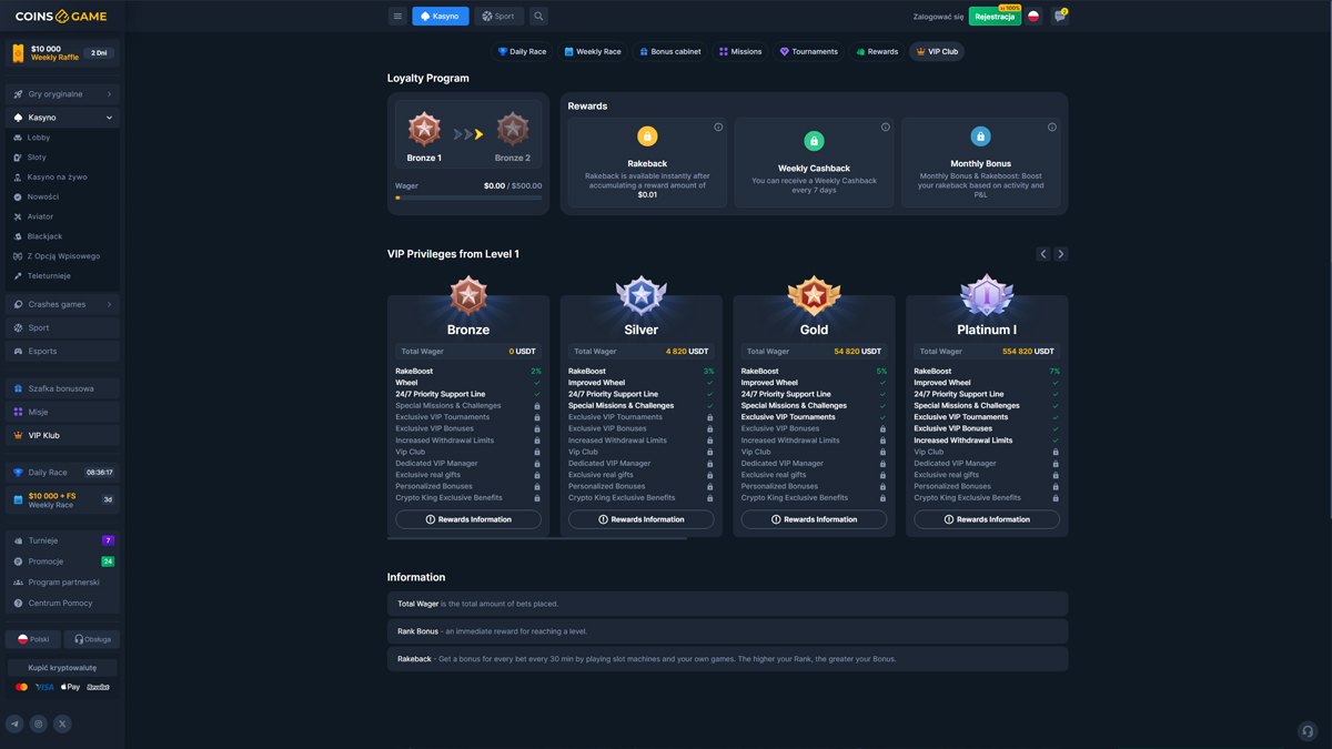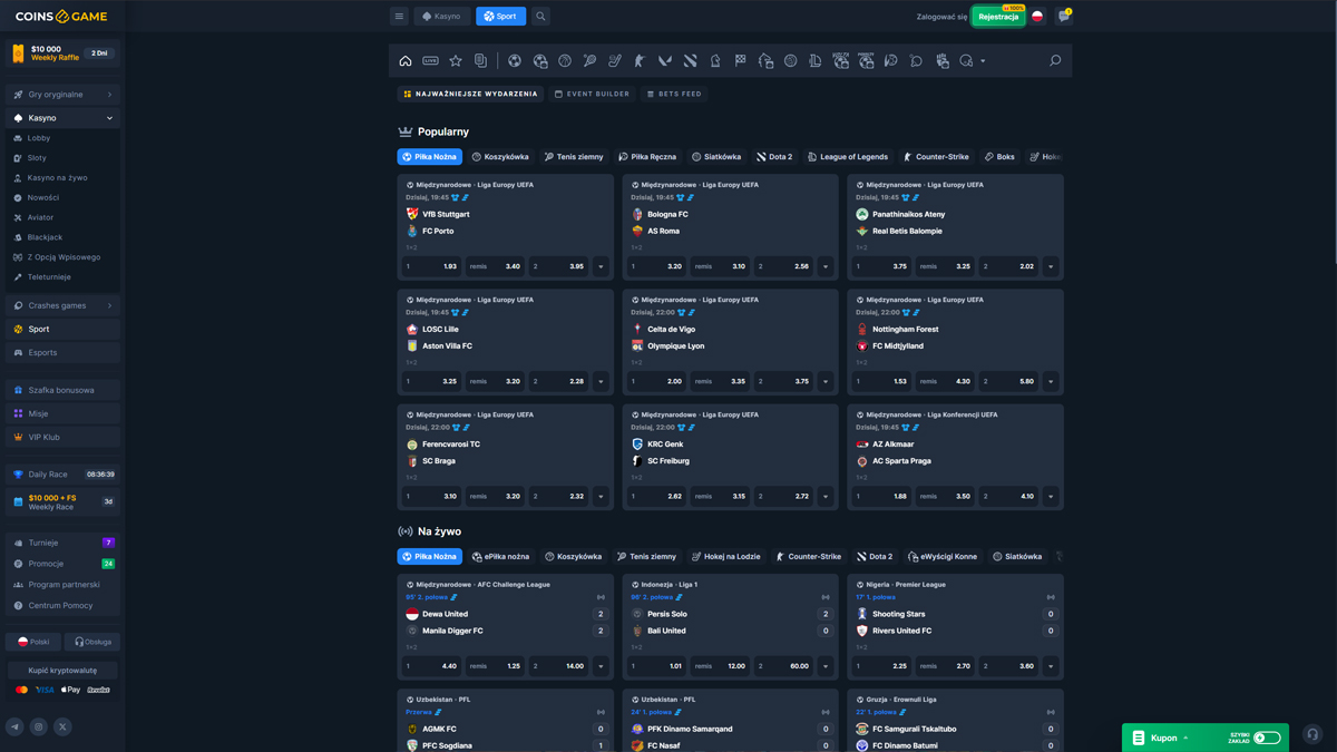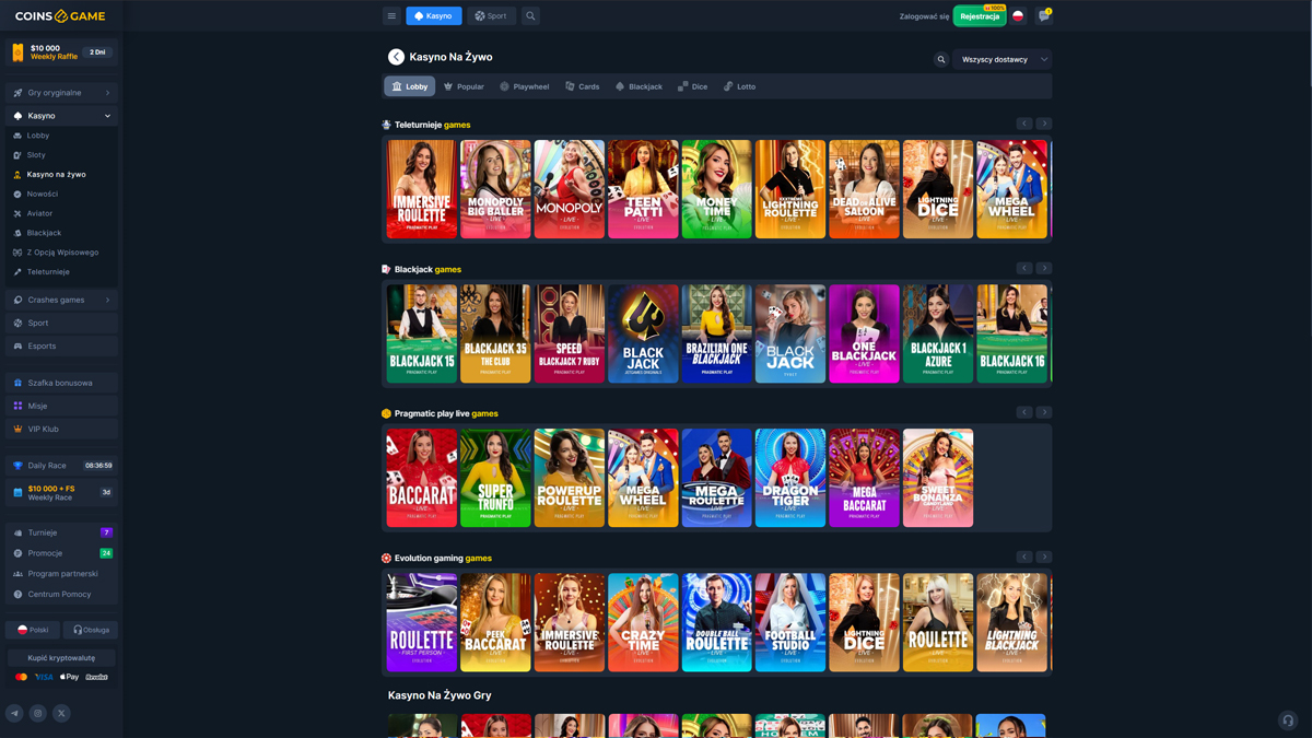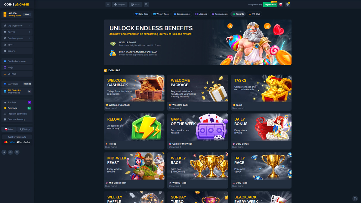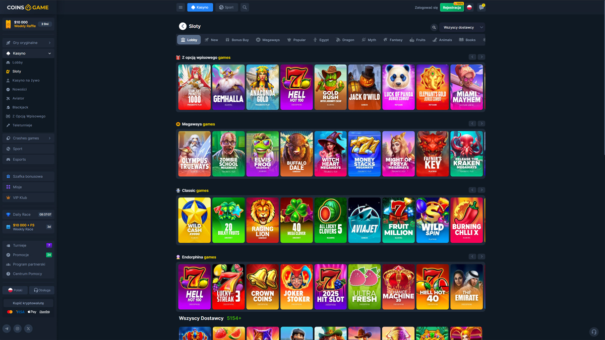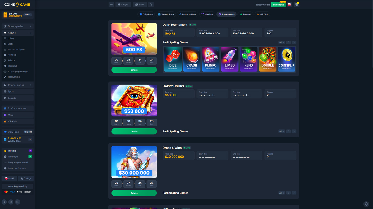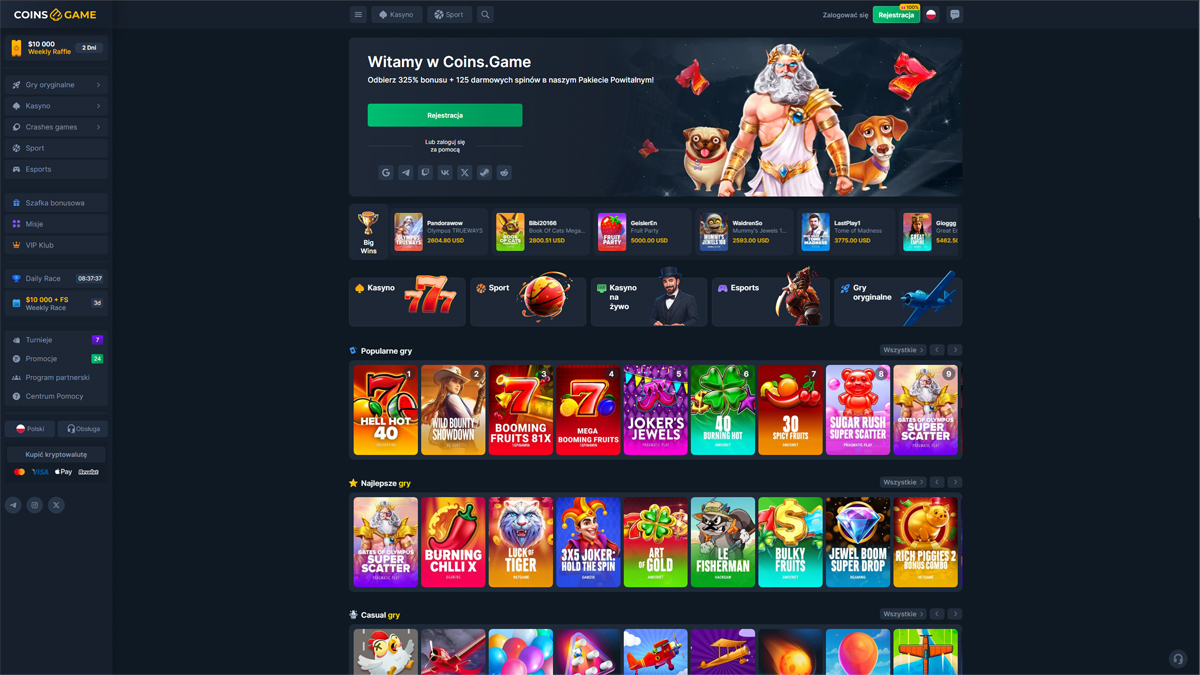 Casino CoinsGame to platforma do gier online oferująca szeroki zakres rozrywki kasynowej, łącząca tradycyjną rozgrywkę na slotach z stołami na żywo i funkcjami bukmacherskimi. Strona prezentuje nowoczesny interfejs, dostępny dla graczy z całego świata, w tym z Polski, co ułatwia polskim użytkownikom odkrywanie gier, bonusów i opcji płatności. Platforma koncentruje się na różnorodności, oferując obszerny katalog slotów, kilka autorskich gier oraz stoły z kasynem na żywo, zaprojektowane tak, by oddać klimat prawdziwego kasyna. Dla graczy w Polsce, CoinsGame Casino zapewnia elastyczne metody depozytu i prosty proces zakładania konta. Strona promuje również bonusy powitalne i okresowe promocje, które mogą zainteresować polskich graczy lubiących dłuższe sesje gry. Kompatybilność mobilna pozwala graczom z Polski na dostęp do gier bezpośrednio ze smartfonów lub tabletów, bez skomplikowanego pobierania. Ogólnie rzecz biorąc, CoinsGame Casino prezentuje się jako dobrze zorganizowana i dostępna opcja dla polskich graczy poszukujących zróżnicowanego środowiska kasynowego z klasycznymi i interaktywnymi doświadczeniami.